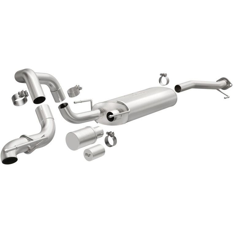 The MagnaFlow Toyota 4Runner Overland Series Cat-Back Performance Exhaust System #19546 will enhance your 4.0L V6 Toyota 4Runner (2003-2024) with MagnaFlow’s renowned deep rumble and dyno-proven performance. MagnaFlow #19546 is weight optimized for additional utility and designed such that its mandrel bent 2.5” diameter main piping is situated more closely to the body than the stock configuration. This combined with a single high-clearance no-tip, passenger-side rear exhaust exit allows for significantly improved ground clearance and departure angles. MagnaFlow exhaust system #19546 is compatible with the most popular bolt-on aftermarket modifications and features our No Drone Technology, which cancels out the natural droning frequencies of the V6 Toyota 4Runner at cruising speeds. This allows for a quiet ride on the highway while retaining the character of your rig’s exhaust note. CNC precision robotic manufacturing enables perfect fitment and hassle-free bolt-on installation. The 100% stainless steel construction of exhaust kit #19546 is covered by MagnaFlow’s limited lifetime construction warranty.